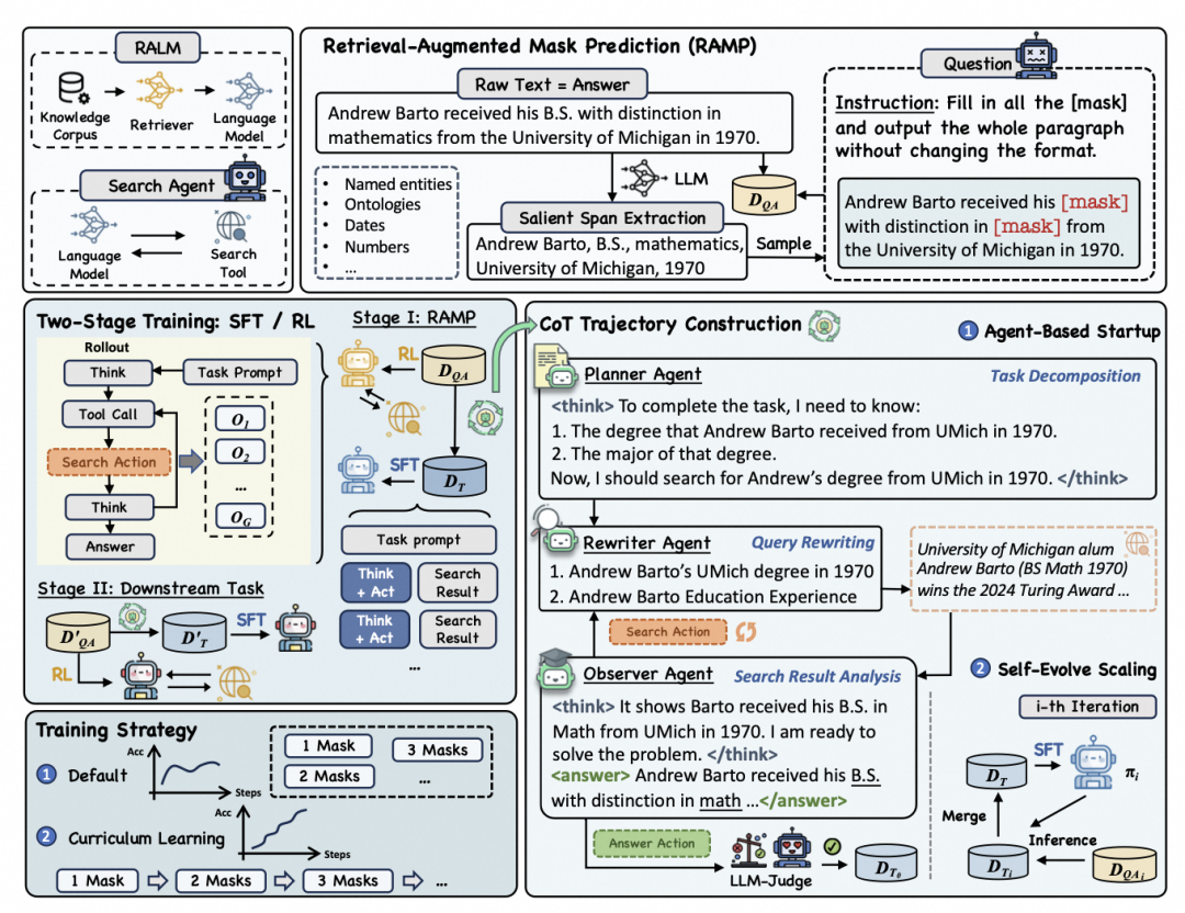 MaskSearch 提出了一种全新的预训练任务——检索增强掩码预测(RAMP) ,让 AI 在大量“填空题”中学习如何调用搜索引擎、多步推理、逐步还原缺失信息,从而掌握通用的搜索与推理能力。