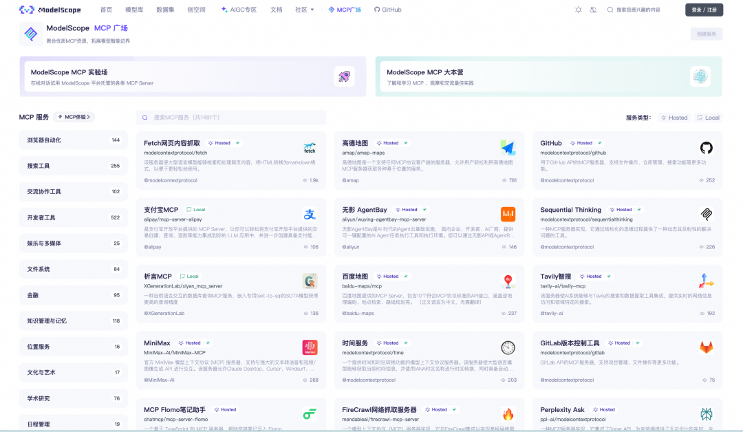 全新上线的魔搭MCP广场提供了中文开源社区最丰富的MCP服务,目前上线近1500种MCP服务器,涵盖搜索、地图、文件系统、开发者工具等最热门领域。