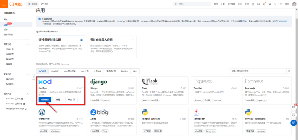 (2)点击【创建应用】按钮,在应用列表中找到【Kodbox】应用,点击【立即创建】。